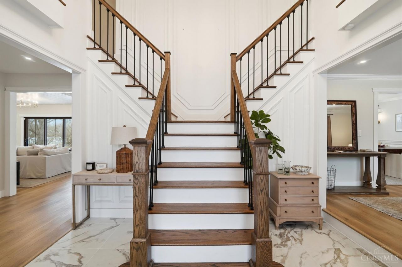 Completely transformed in 2024, this exceptional Beckett Ridge home showcases elevated design and high-end finishes throughout. A stunning chef's kitchen anchors the home with an 11-foot quartz island, stainless steel appliances & sunlit breakfast area. The formal living room features custom built-ins, while the inviting family room w/ stone fireplace walks out to a patio overlooking the pond and golf course. The main level also includes a study, laundry room, and half bath. Upstairs, the expansive primary suite offers a private sitting area, fireplace, walk-in closet, and spa-inspired shower with skylight. The finished lower level includes a recreation room, wet bar, full bath, and bonus space. New in 2024: luxury flooring, efficient HVAC, casement windows, entry doors, roof, kitchen, baths. 2025 upgrades: electrical w/ surge protector, larger water heater, gorgeous lighting, smart wiring, and retractable window shades.